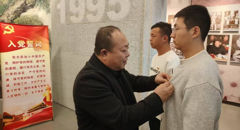 活動(dòng)現(xiàn)場(chǎng),支部書(shū)記擔(dān)任領(lǐng)誓人,帶領(lǐng)全體黨員和預(yù)備黨員逐字逐句重溫入黨誓詞。黨員們整齊列隊(duì)面向黨旗,右拳高擎、齊聲宣誓:“我志愿加入中國(guó)共產(chǎn)黨,擁護(hù)黨的綱領(lǐng)......隨時(shí)準(zhǔn)備為黨和人民犧牲一切,永不叛黨?!鼻f嚴(yán)的誓詞在紀(jì)念館內(nèi)回蕩,既是對(duì)入黨初心的回望,也彰顯著對(duì)黨的忠誠(chéng)承諾。宣誓結(jié)束后,支部書(shū)記為兩名預(yù)備黨員佩戴黨徽,并叮囑他們要以老黨員為榜樣,牢記對(duì)黨的承諾,不辜負(fù)黨和人民的期望。兩名預(yù)備黨員也現(xiàn)場(chǎng)表達(dá)了加入黨組織的堅(jiān)定決心,表示將嚴(yán)格遵守黨的章程,為黨和人民的事業(yè)不懈奮斗。